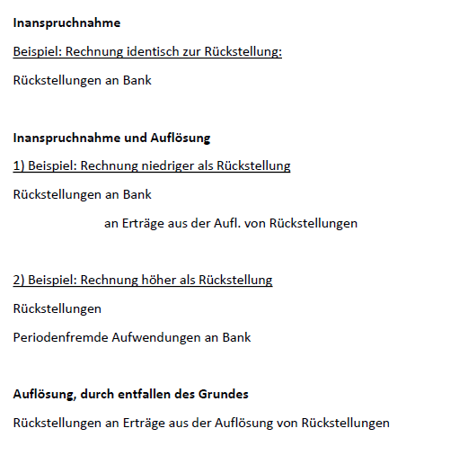 Nach § 249 Abs. 2 Satz 3 HGB dürfen Rückstellungen aufgelöst werden, soweit der Grund hierfür entfallen ist. Dieses Kriterium ist ausschlaggebend für die Abgrenzung zur Inanspruchnahme. Als in Anspruch genommen gelten die Rückstellungen bzw. Teile der Rückstellung für die ein Aufwand in einer Folgeperiode entsteht. Die Inanspruchnahme der Rückstellung erfolgt immer dann erfolgsneutral, wenn die Höhe der Rückstellung und die Höhe der tatsächlichen Verpflichtung übereinstimmen. Sollten die beiden Werte jedoch voneinander abweichen, so ist der Differenzbetrag in Form von außerordentlichen Erträgen (wenn Rückstellung höher als tatsächliche Verpflichtung) oder außerordentliche Aufwendungen (wenn Rückstellung niedriger als tatsächliche Verpflichtung) zu buchen. Dies wird ebenfalls als Auflösung beschrieben und ist damit in der entsprechenden Spalte des Rückstellungsspiegels zu erfassen.